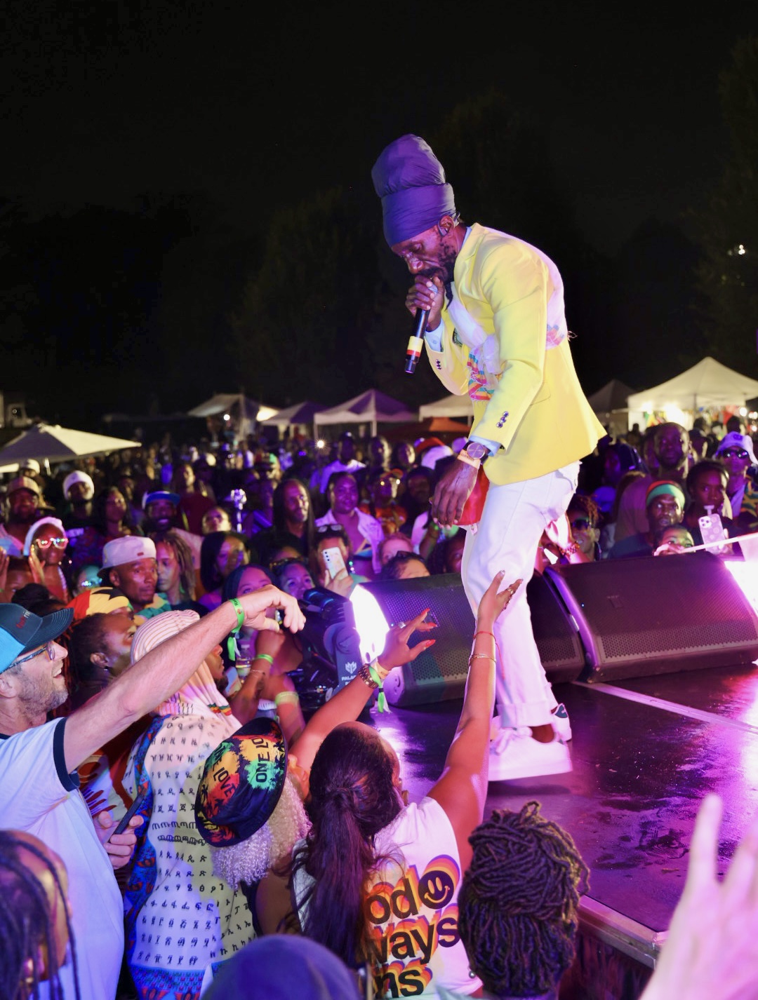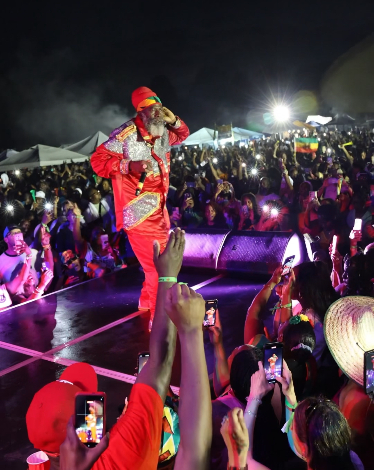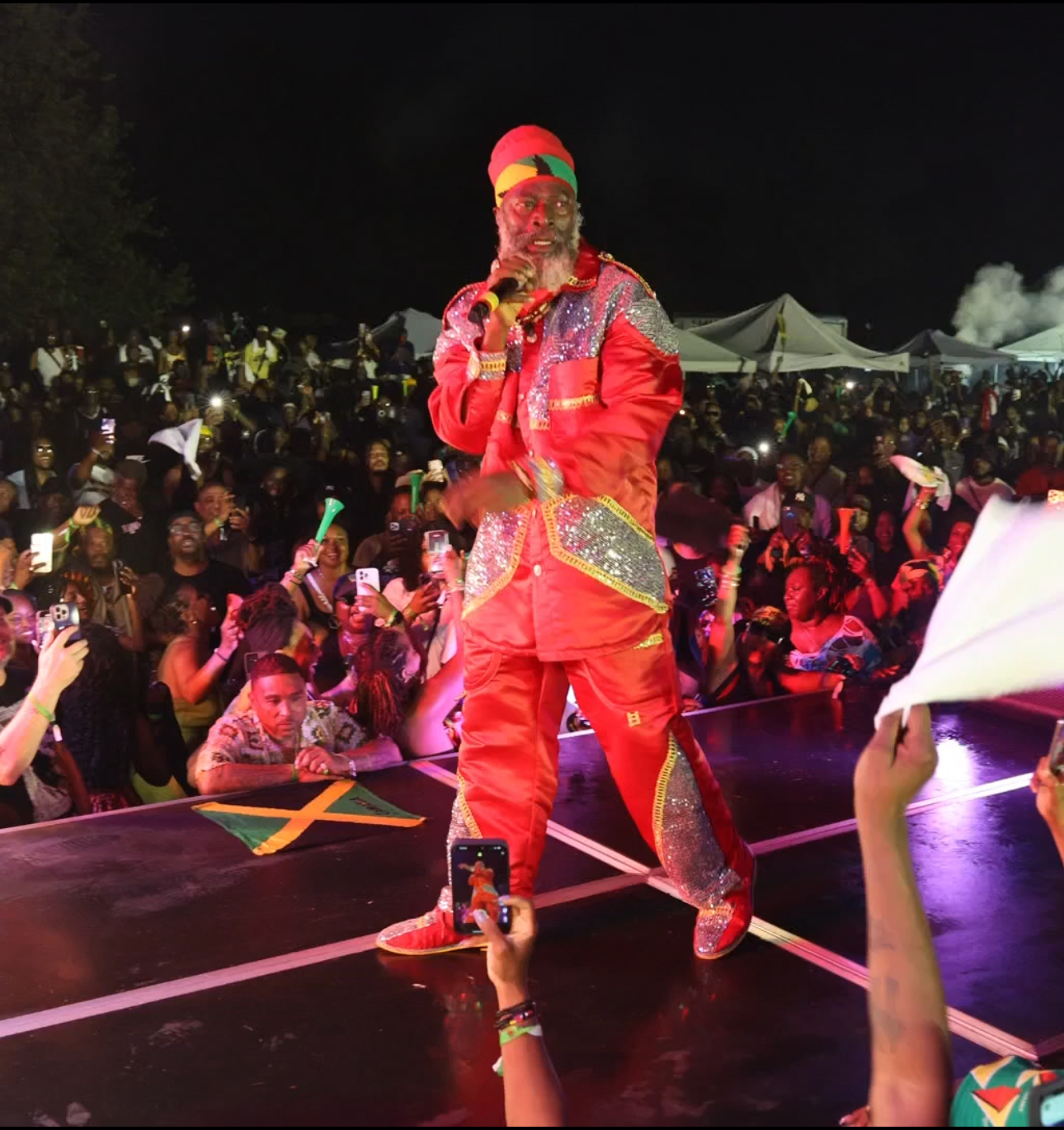 Next, the legendary Capleton, known as “The Fireman”, took the stage in a stunning ensemble of red and shimmering silver, complete with matching footwear that caught the lights spectacularly. From the moment he stepped onto the stage, Capleton delivered a performance that was nothing short of monumental. Hits like “Slew Dem”, “Dash A Fire”, “Badness”, “Chalice”, “Small World”, and “Raggy Road” had the crowd roaring like a lion, with audience members singing along in unison, horns blasting, fire blazing, and the energy palpable throughout the park.